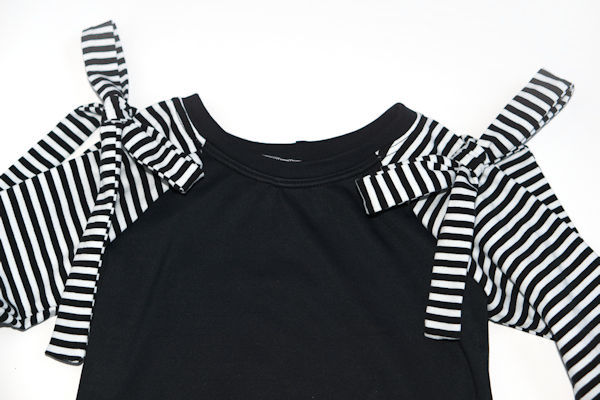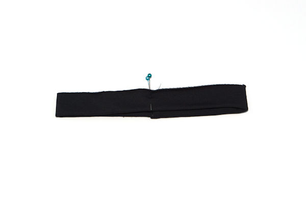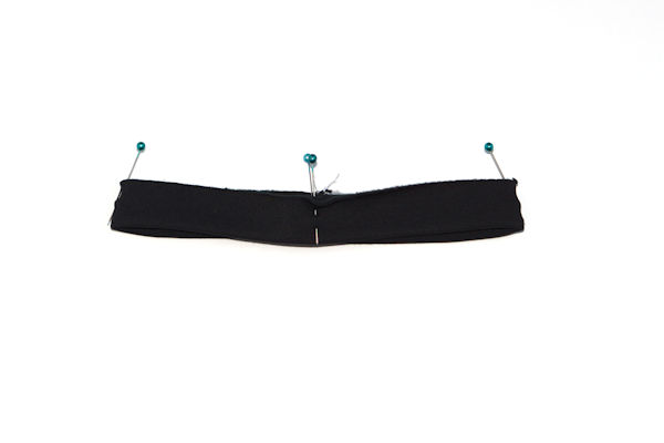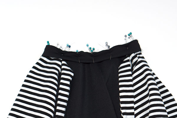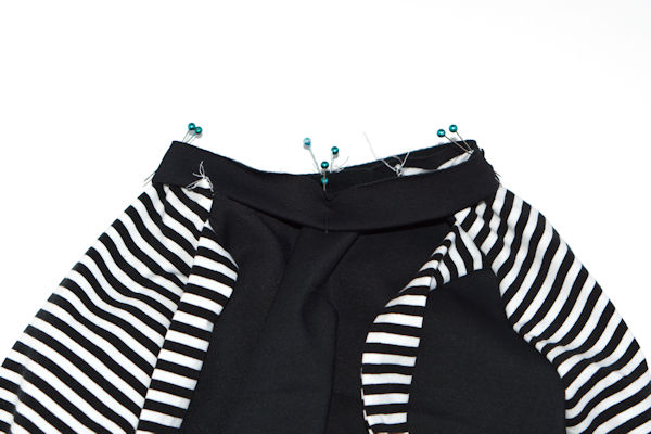 Quarter the neckband (as in previous examples). Align the quarter points with the bodice quarter points, placing the seam of the neckband at the center of the back bodice. Pin in place, stretch the neckband quarters to fit the bodice quarters, pin well and sew together.