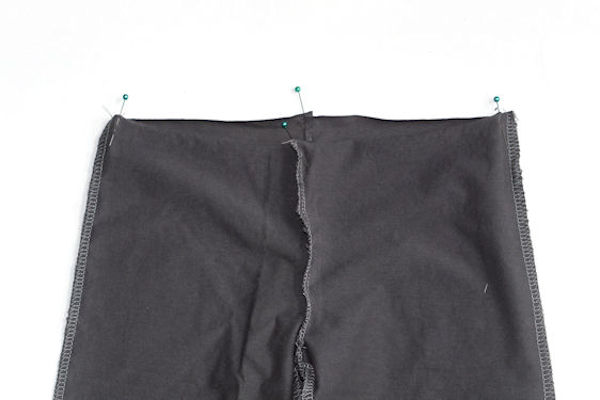 Slide the cuff over the pant leg, right sides together. As the two raw edges are aligned on the cuff and pant leg, the cuff is rotated so as to align it’s quarter points with the quarter points on the pant leg. It’s then pinned in place at these points.