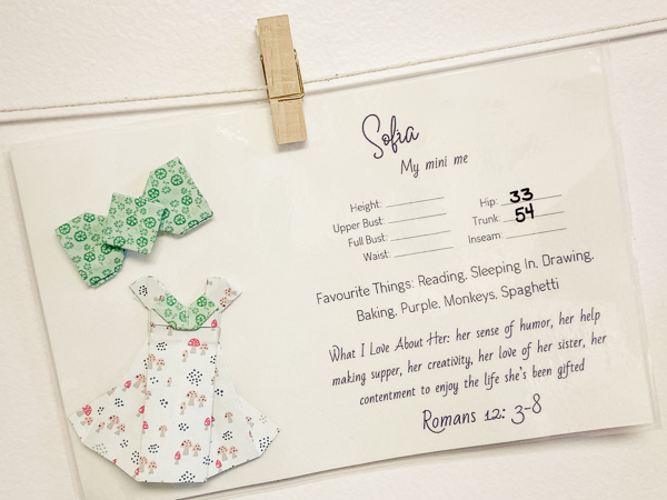I have these cards clipped onto a string in my sewing room. It’s front and centre where I work so it’ll be a quick glance when I’m working on their clothes and, dang it, they DO look pretty cute on the wall.