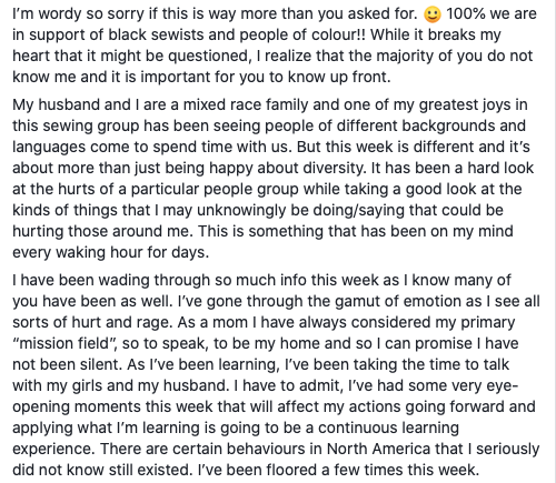 I’m sitting here blown away, humbled, inspired, motivated and now I’m writing. I’m late to the party and there are reasons for this – some justified and some not. But here I am. I want to be real in a way that I have never been on the platform that is my sewing business. I’m about to break a bunch of my own rules and to share a part of me that I’ve typically kept private. I’m fairly certain that some would tell me not to dare this but I hope you’ll stay with me here because my desire is not to alienate a single person, but to hopefully inspire someone to take a deep breath and maybe realize your teeth are clenched and they need to relax. I’m going to share things that I know not everyone reading is going to agree with but my goal is not to make you agree with me. Rather I think you will still be inspired by the voices and speakers that I’m going to link to below. So skim over my many words. They aren’t the best part. They are just my own experience in navigating through the noise the last few weeks. But listen to the videos. They will amaze you. Pretty sure.
