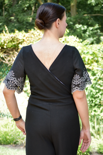 So, I’ve recommended more structured knits like ponte, knit, or cotton lycra that hold their shape well, but I do encourage you to experiment with other fabrics with a very clear warning that if you are not familiar with how your particular fabric will hang and drape, this should be muslined first. I have extra tips in the tutorial on recommended steps to stop and do a fit check along the way as well as what types of things you should look for that will affect your final garment. Have a good read through those sections and then experiment! Can you imagine a velvet pantsuit with sheer sleeves?? Or here is one tester version with the most gorgeous fabric choice for the sleeves. Elegant!