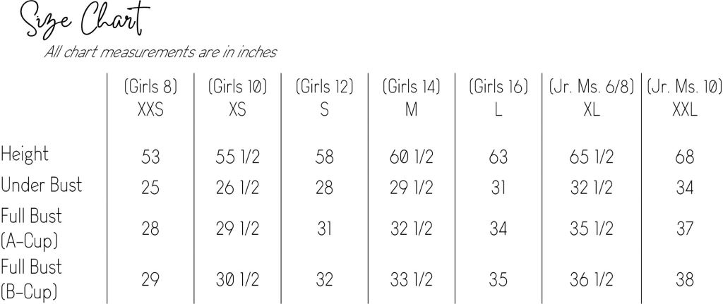 If you’ve made any of our Junior Miss patterns will be used to using the upper bust and full bust measurements to determine your size and then cup-size. These bralettes are a little different. For these you’ll first need to use your underbust measurement to choose a size, then your full bust measurement to see which cup to use in that size. Blending for height is also necessary but is made easier by the use of a lengthen/shorten line. (You can check out this Sofiona Blog post for more info on how to use those). Be sure to check the size chart, as each size corresponds to a different height just like on our Girls size chart.