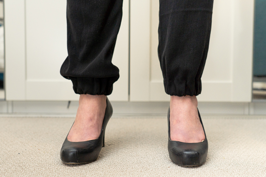 Depending on your fabric choice (a sturdier corduroy or twill, or a drapy viscose or linen) you will likely find that the pant leg hangs differently. It’s a great idea to check your pants with the shoe/boot/heel style you most intend to wear them with before hemming or permanently sewing the cuffs on to see if you’re happy with the overall length. Drapier fabrics, for example, may tend to pool down over the cuff where a sturdier fabric wouldn’t. Or you may find you want a slightly more cropped pant if you intend to wear them with ankle boots so they’re not grabbing/getting pushed up by the boot.