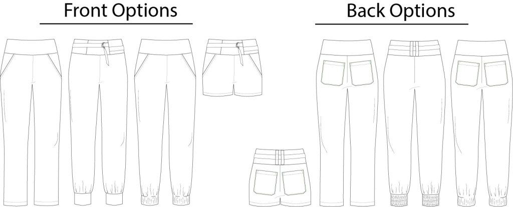 These pants are drafted for mid-weight woven fabrics with 10-25% stretch. They feature a high waist wide waistband with optional belt, side zipper closure and multiple hem/cuff options. Front and back pockets are also both optional. One final inclusion to this pattern is a shorts cutline. The shorts have a 3 1/2″ inseam, but you can use the lengthen/shorten line to adjust this to your own desire.