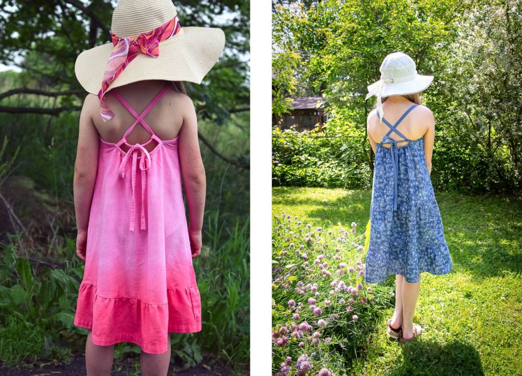 The shoulder straps are narrow pieces of binding that reach to the elastic waist back and feed through simple loops before tying together. I really like how the open back with long draping ties has a relaxed feel to it.